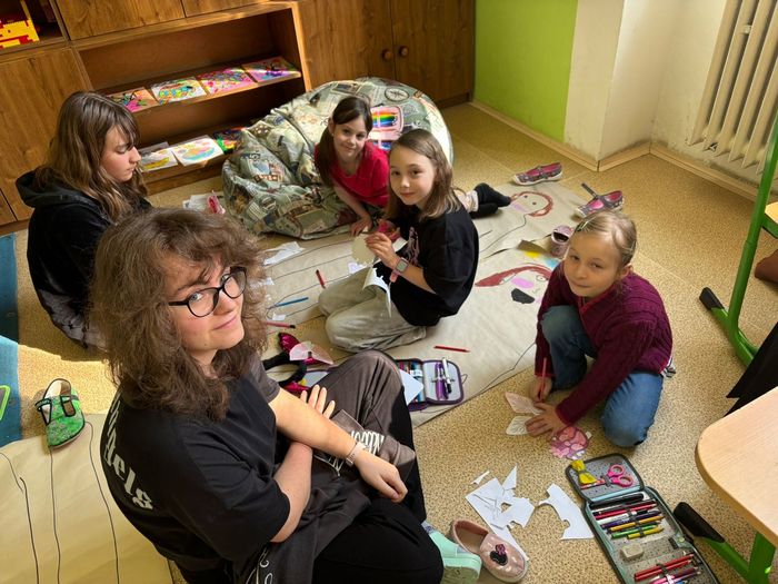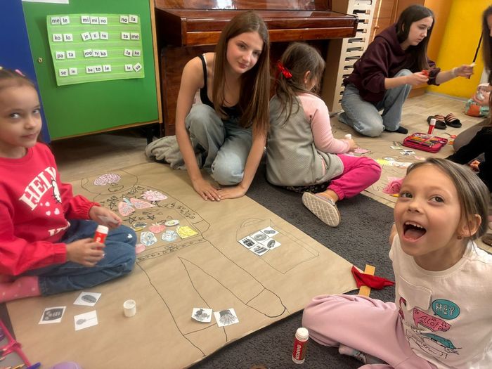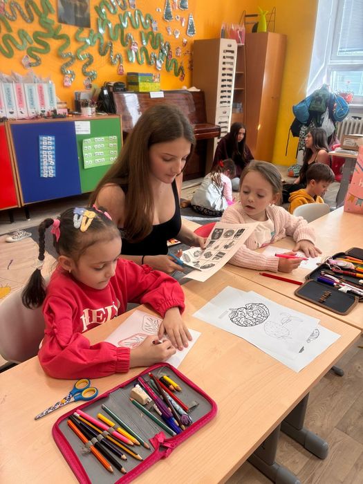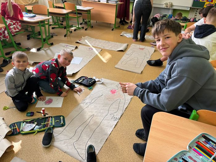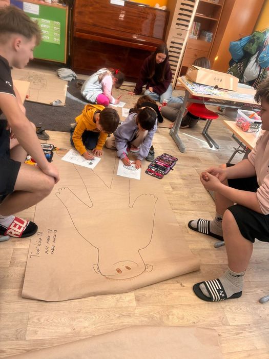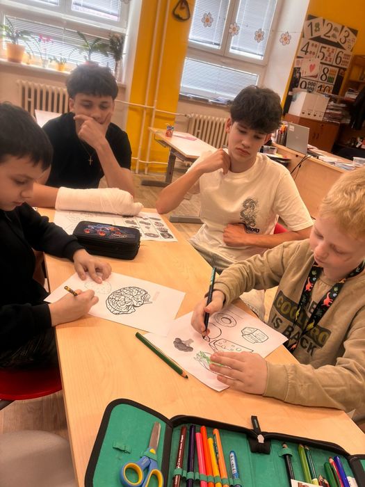 Další setkání žáků prvních a devátých tříd bylo zaměřeno na objevování a poznávání lidského těla a zásad zdravého životního stylu. Starší a zkušenější žáci pomáhali mladším při kreslení a popisování jednotlivých částí těla a vnitřních orgánů. Společná práce podporovala nejen učení, ale také vzájemnou spolupráci, trpělivost a radost z tvoření. Děti si uvědomovaly, jak důležité je pečovat o své tělo i zdraví. Aktivita tak krásně naplnila myšlenku „Ve zdravém těle zdravý duch.“