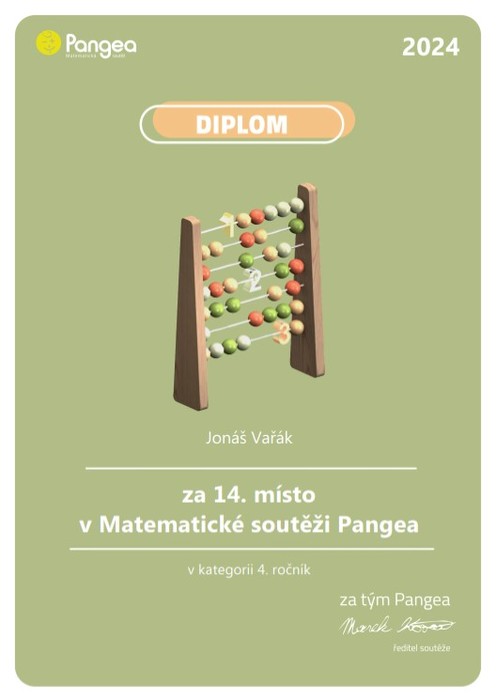 Matematická soutěž Pangea je určena pro všechny žáky, kteří rádi řeší netradiční úlohy z matematiky. Pangea ale není ledajaká soutěž. Pracuje s reálnými příklady ze života a nabízí možnost účasti v této soutěži žákům 4. až 9. ročníků ZŠ a studentům odpovídajících ročníků víceletých gymnázií z celé České republiky. Letošní již 11. soutěžní ročník byl zaměřen na úlohy z oblasti kinematografie a sportu. Do této soutěže se pravidelně zapojují i žáci Masarykovy ZŠ v Bohumíně, kteří se prostřednictvím online připojení na školních počítačích přihlašují k řešení soutěžních úloh školního kola. V tomto školním roce se do soutěže aktivně zapojilo celkem 262 žáků školy v šesti kategoriích. Mimořádného úspěchu dosáhl v kategorii žáků čtvrtých tříd Jonáš Vařák, který se se svými výsledky ze školního kola probojoval do finálového kola mezi 60 nejlepších z celé České republiky. Finále se konalo 14. 6. 2024 v Národním muzeu v Praze, kde byl pro všechny finalisty připraven i velmi zajímavý doprovodný program. Jonáš se ve finále umístil na výborném 14. místě. Ke krásnému výsledku gratulujeme a věříme, že i příští rok se podaří na letošní úspěch navázat.