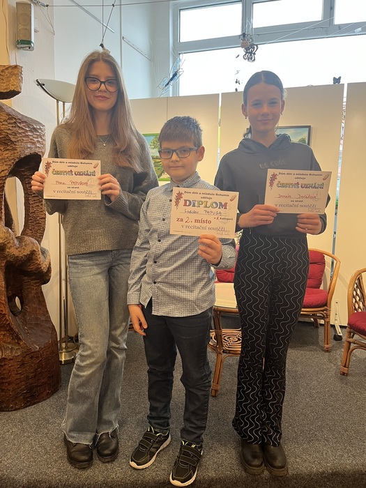 Naši školu v okresním kole bude reprezentovat Ladislav Papuga ze 6. C, který si ve třetí kategorii vybojoval 2. místo s mistrovskou interpretací Erbenovy Polednice. Kromě něj se ocenění dočkaly i Marie Papugová z 9. B a Daniela Dvořáková ze 7. A, které porota odměnila čestným uznáním.